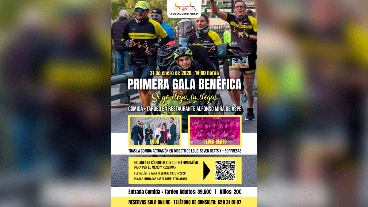 La asociación Zancadas Sobre Ruedas celebrará el próximo 31 de enero en Aspe su primera Gala Benéfica, un evento solidario que nace con un doble objetivo: recaudar fondos para continuar con sus actividades durante 2026 y reconocer el apoyo recibido a lo largo del último año.