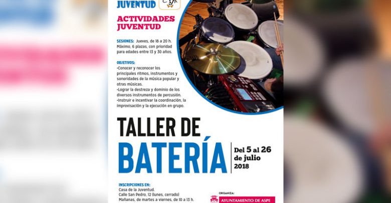 La concejalía de Juventud del Ayuntamiento de Aspe organiza un taller de batería. La actividad se desarrollará durante los jueves…
