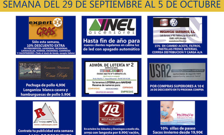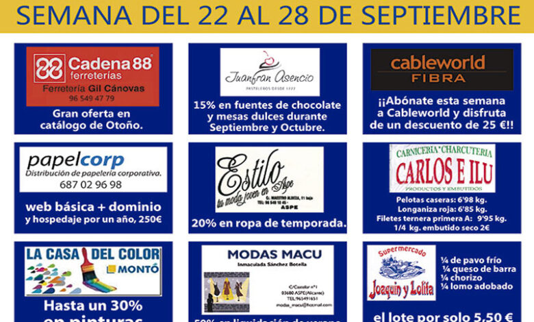 Los establecimientos con descuentos del 22 al 28 de septiembre, son: Ferretería Gil Cánovas, Pastelería Juanfran Asencio, Cableworld, Papel Corp,…